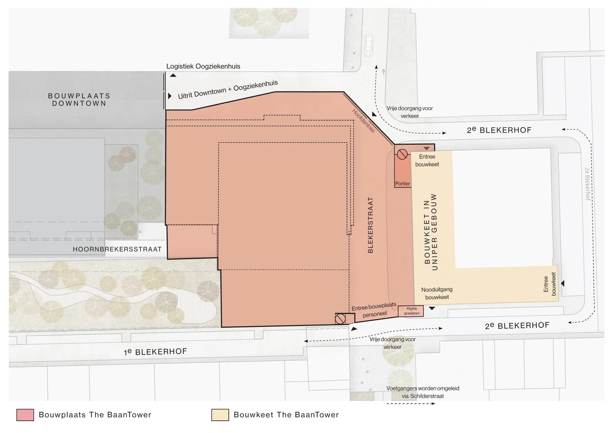 De bouwplaats van The BaanTower is afgezet met hekken. Op onderstaande tekening is aangegeven hoe wij de bouwplaats inrichten, waar de in- en uitritten voor het bouwverkeer zijn en waar de bouwkeet zich bevindt.