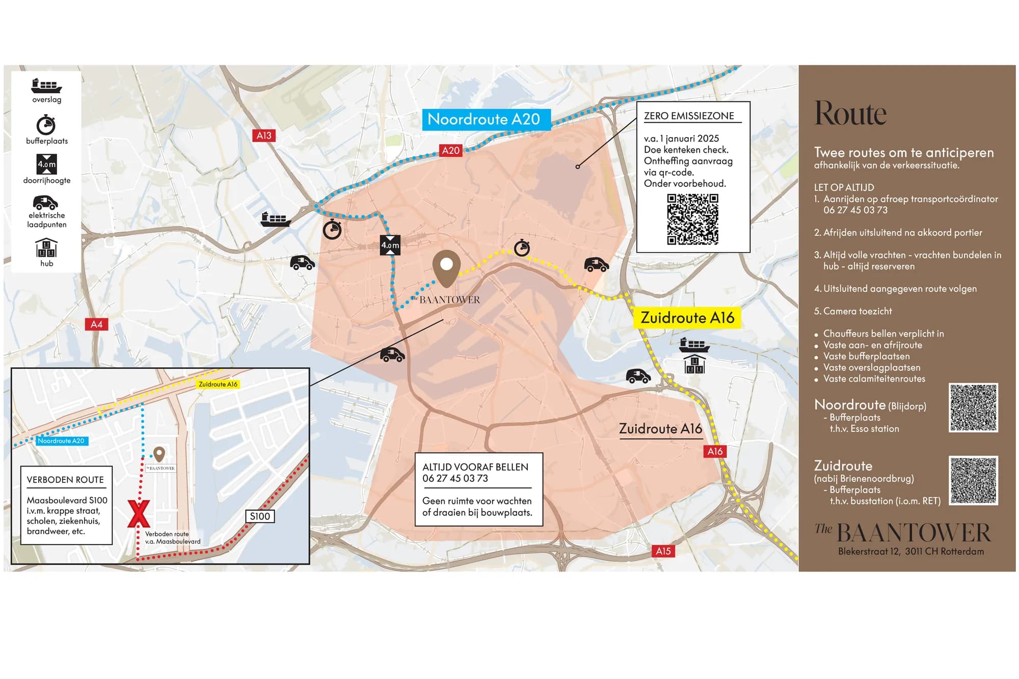 Om een goede bereikbaarheid in het Baankwartier (en daarbuiten) te garanderen, hebben wij met de gemeente Rotterdam afspraken gemaakt over de routing van ons bouwverkeer. Deze afspraken worden hieronder uitgelegd.